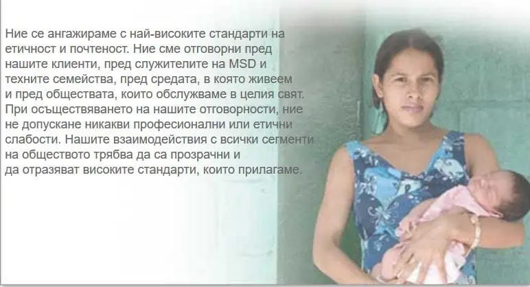 - чрез Службата по етика на MSD, затвърждаване на общия ангажимент на компанията към етичните бизнес практики и поведение, на всяко ниво на дружеството; и